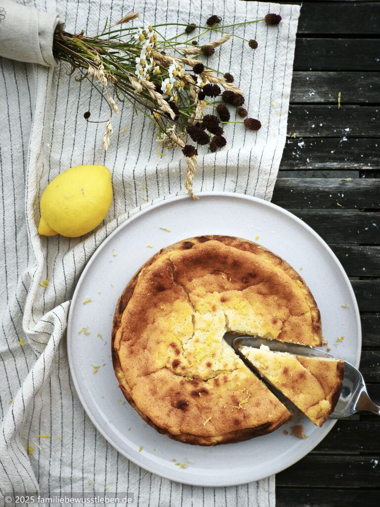 - Im vorgeheizten Ofen 50–65 Minuten backen, bis die Oberfläche goldgelb ist und der Kuchen nur noch leicht wackelt.