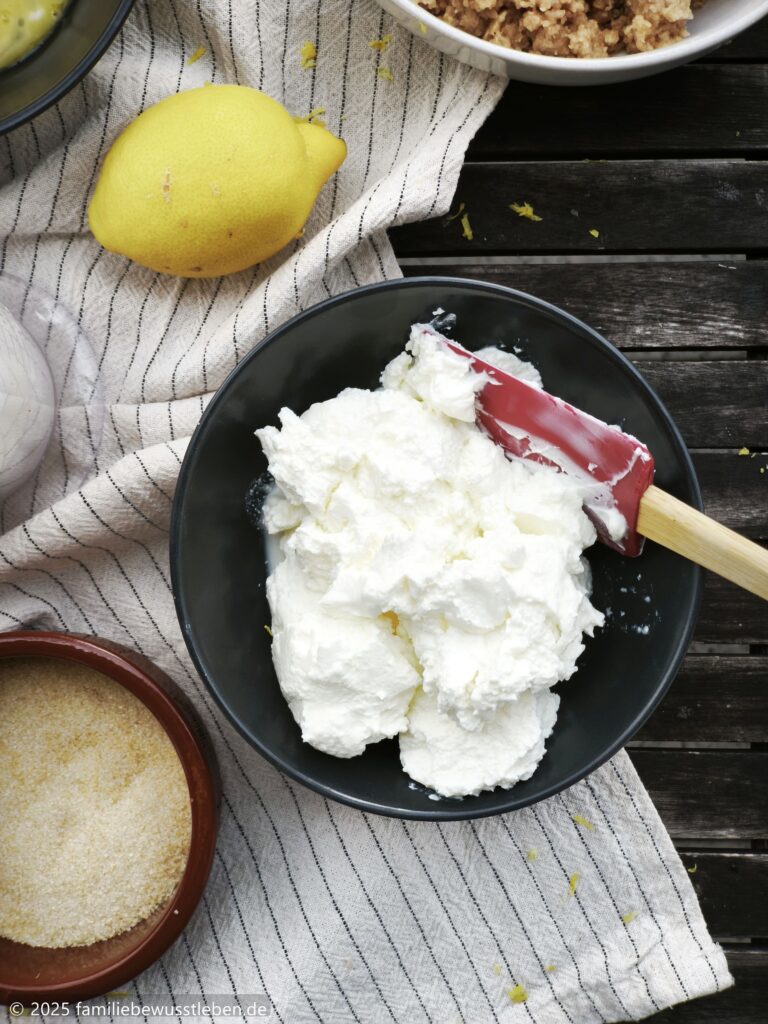 - Quark, Milch, Zucker, Zitronenschale und -saft, Stärke und Eigelb in einer großen Schüssel glatt rühren.